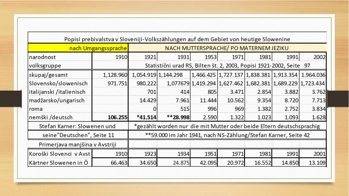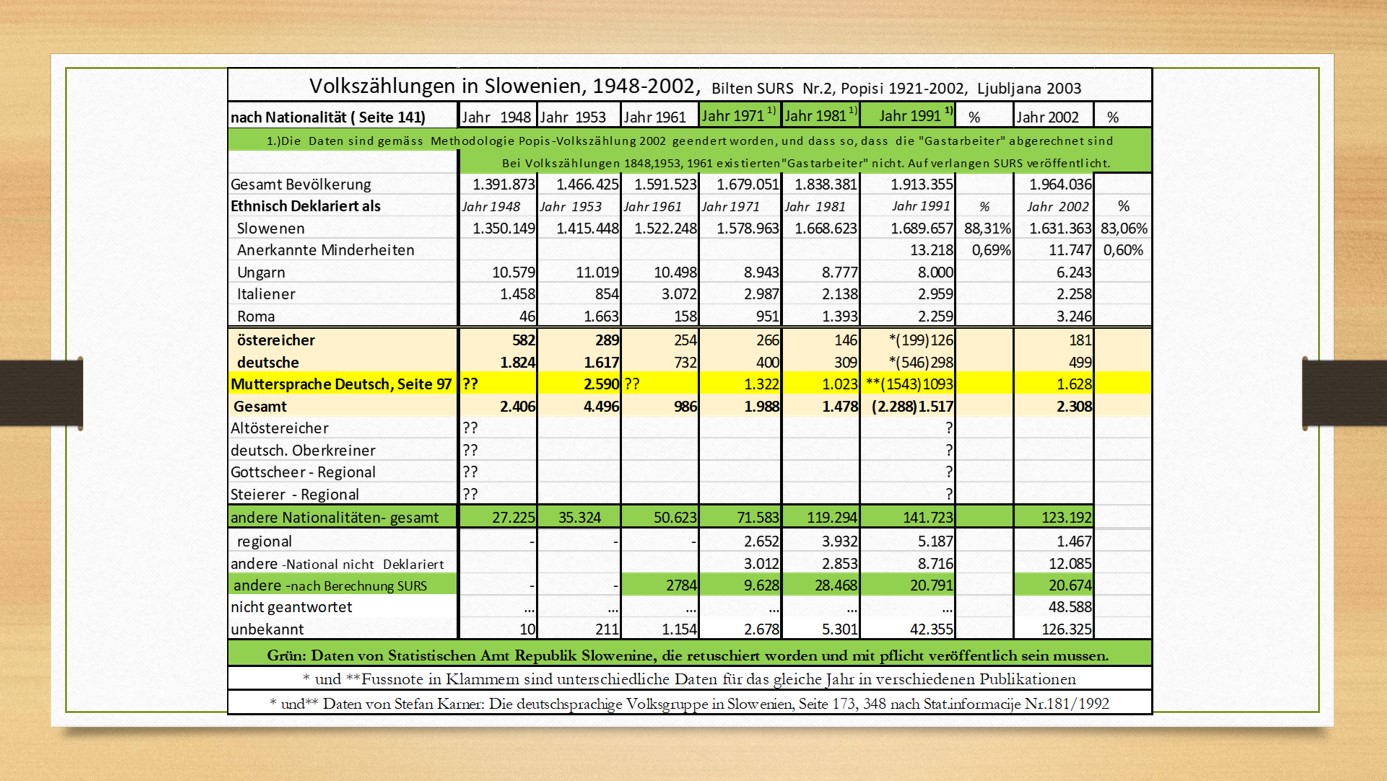 Po moji oceni je zato treba uradno številko za leto 2002 »1628 materni jezik nemščina« ponovno pomnožiti s faktorjem 3, to je potem 4884 nemško govorečih – večinoma novih lastnikov starih, odvzetih nepremičnin. Tiha večina se bo aktivirala šele, ko bo nemška manjšina v Sloveniji končno, ponovno priznana, in nemška manjšina v Sloveniji ne bo več tabu tema in jo slovenski skrajneži ne bodo smeli več naganjati v tujino, ker so državljani v Sloveniji.