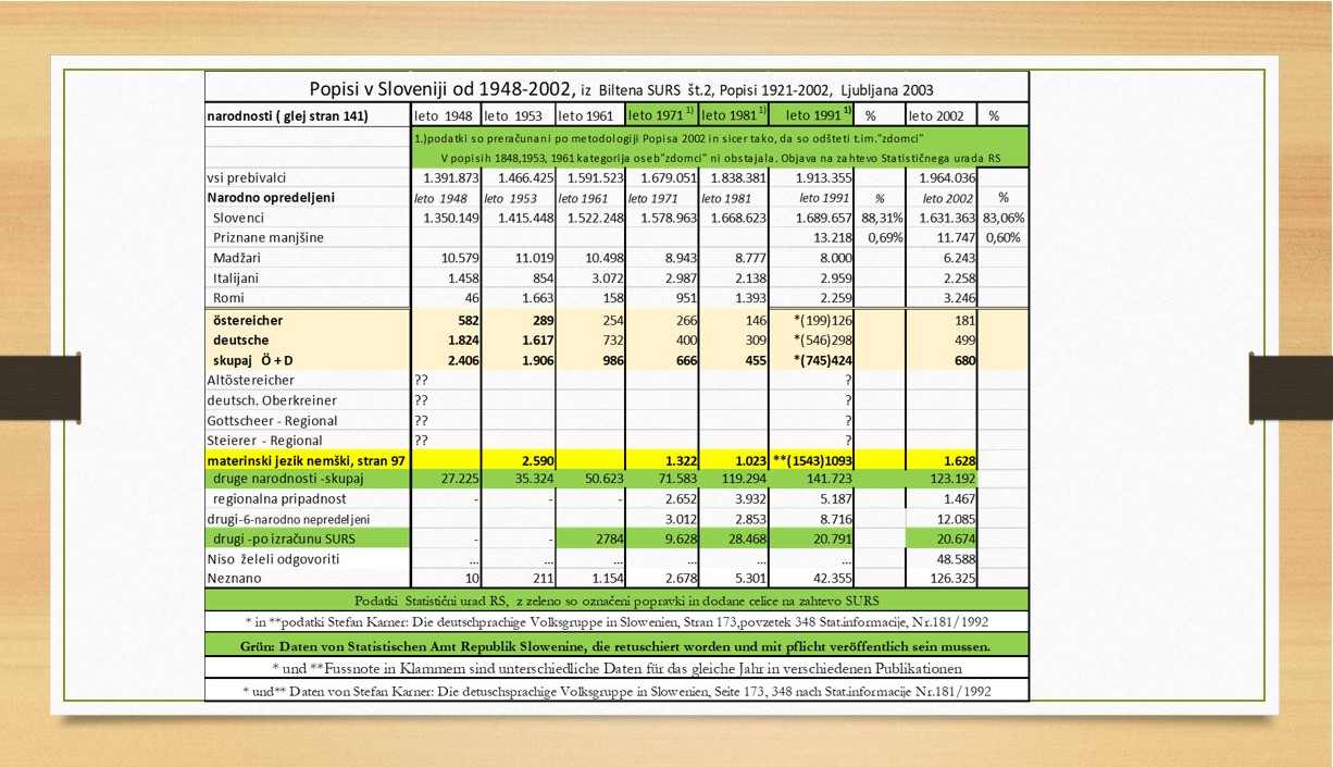 Ob uradnem podatku za leto 1991 da je v Sloveniji samo 126 Avstrijcev in 289 Nemcev. Očitno tem številkam ni verjel niti magister Marjan Žnidaršič, strokovnjak s tega področja. (Statistični urad sam trdi, da taki podatki niso verodostojni, saj odgovarjanje na to vprašanje ni bilo obvezno)